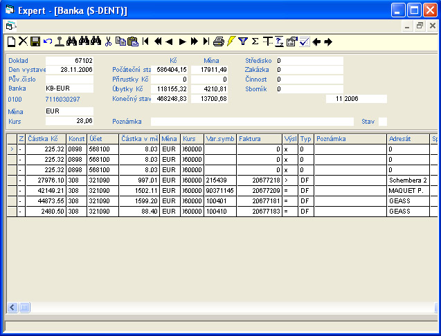 Můžete mít několik bankovních účtů u různých bank. Každý účet má své bankovní výpisy a svůj konečný stav. Konstantní symbol na řádku výpisu určuje, zda se platí faktura či dobropis, nebo zda se jedná o jiný převod peněz (do pokladny, výplaty atd.).